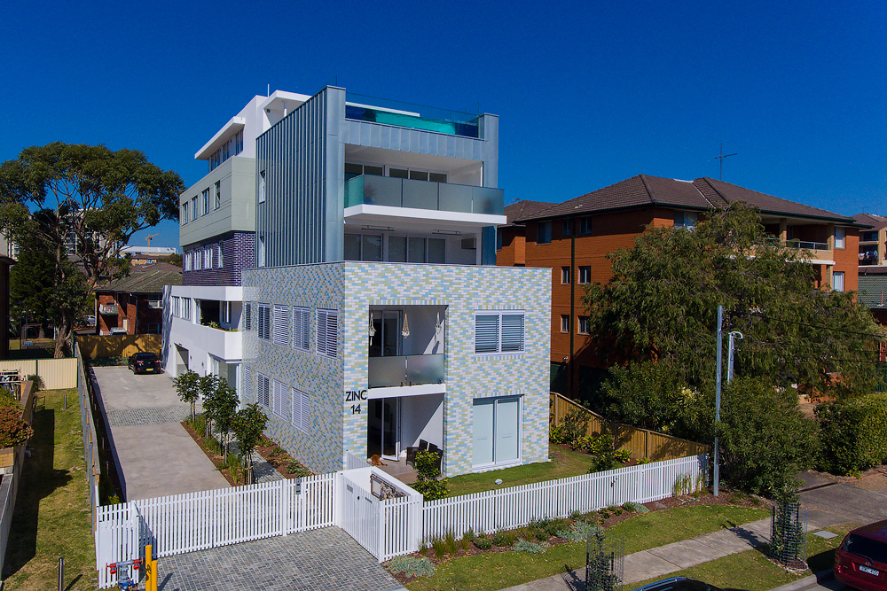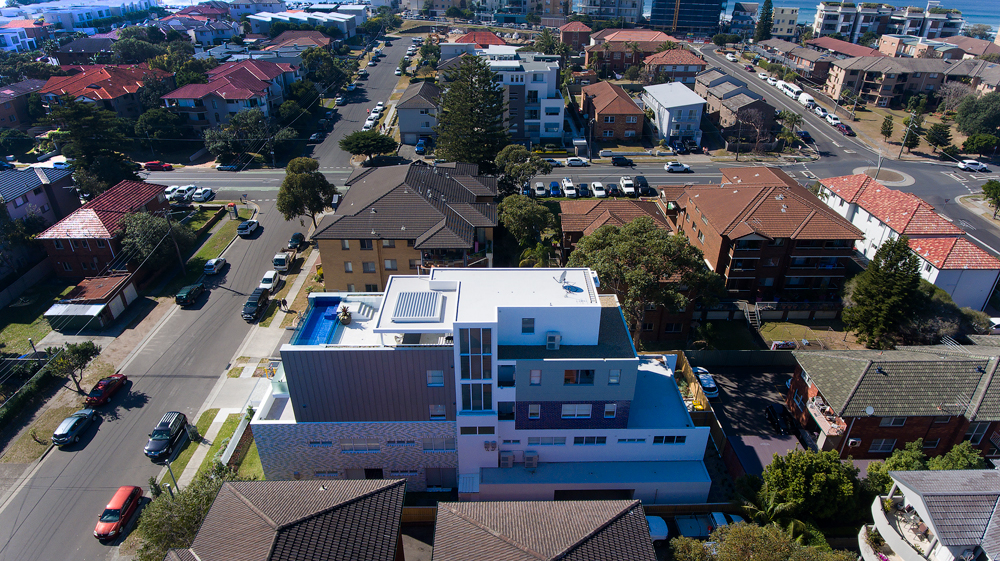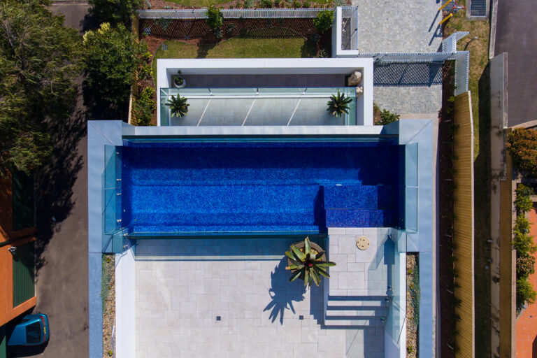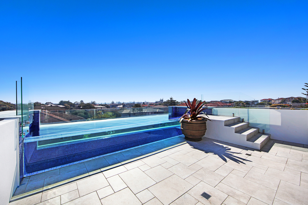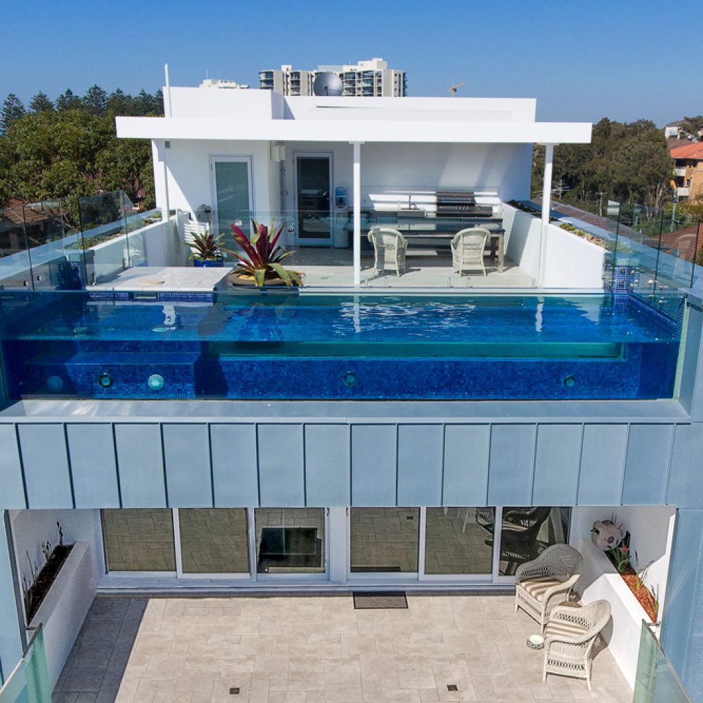 Cronulla, New South Wales. Rooftop pool with custom glass wall. Fully tiled with imported Spanish mosiac glass.