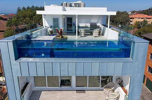 If you have commanding views from high up, you may wish to incorporate a glass wall into your pool. During the construction we will include a rebate to crane in a custom glass panel. Glass wall pools require expert engineering and specialist construction. Lap of Luxury Pools can provide you with advice and guidance including regulatory approval for your glass wall pool.